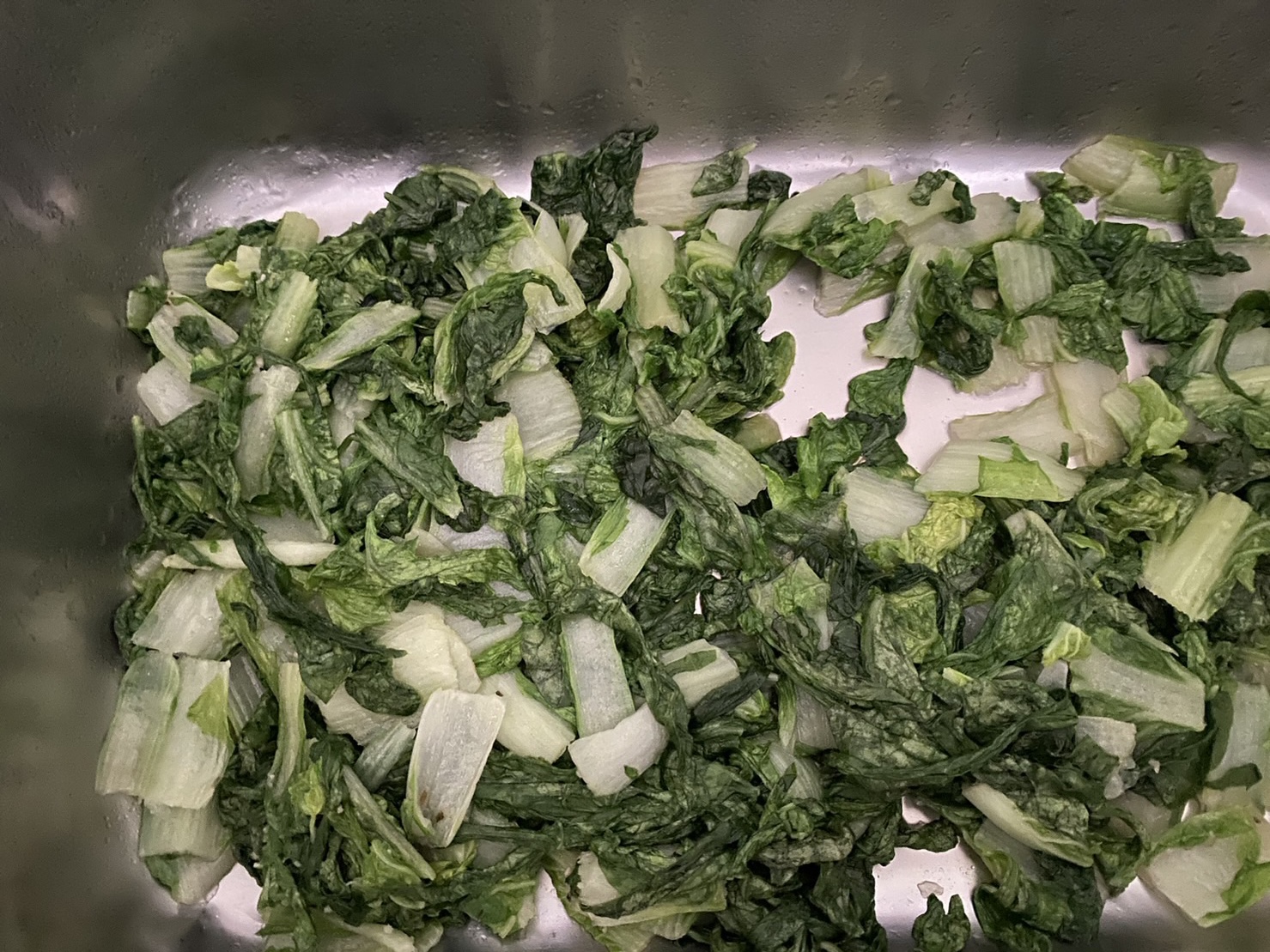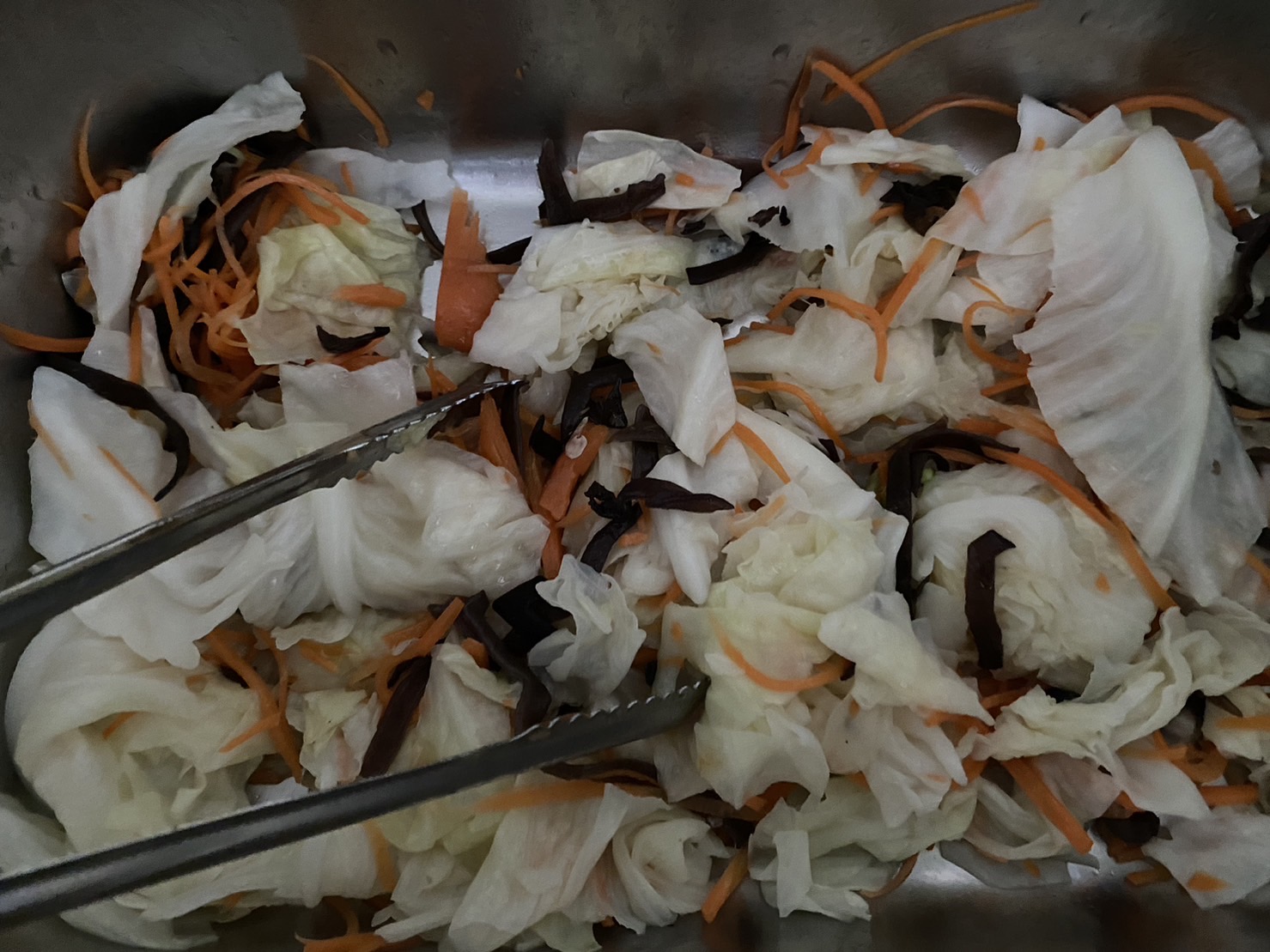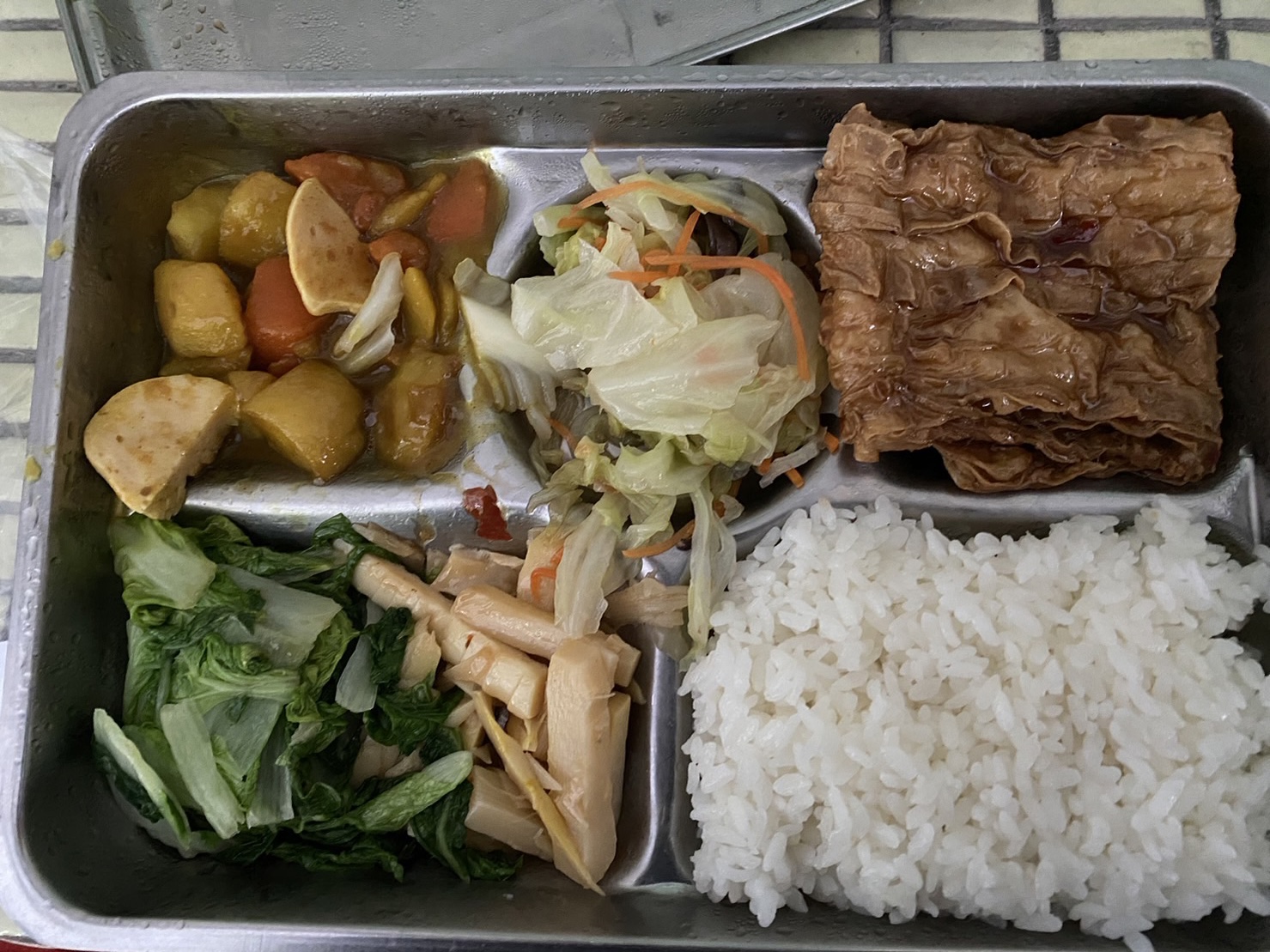 素食-主食:有機白飯、主菜(1)照燒豆皮、主菜(2)咖喱洋芋燒素腰花、副菜:木耳高麗、青菜:小白菜、贈:筍干