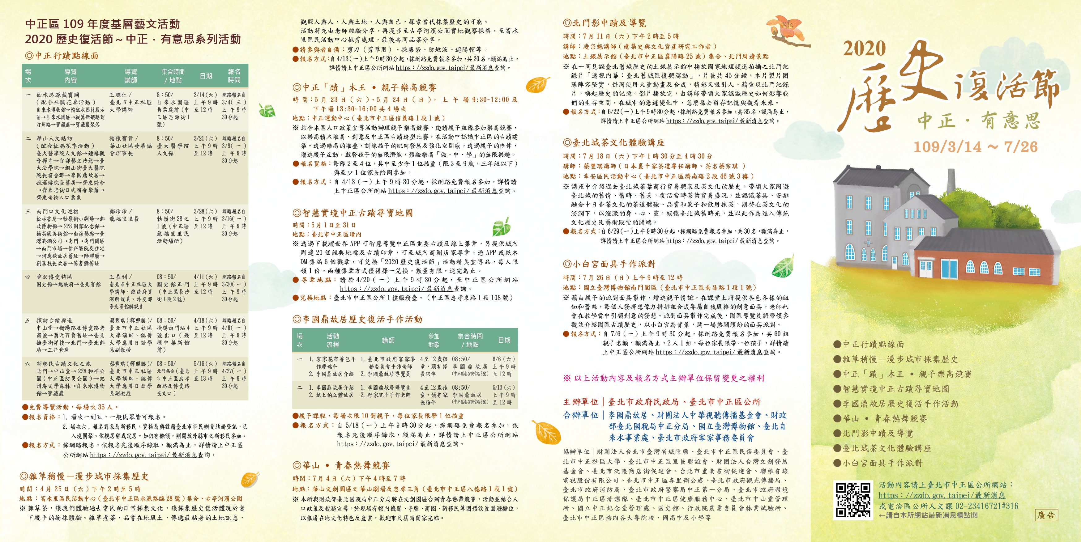 「2020歷史復活節~中正.有意思」 系列活動,於109年3月14日至8月16日辦理,活動包含「中正行蹟點線面」、「雜草稍慢-漫步城市採集歷史」、 「智慧實境中正古蹟尋寶地圖」、「李國鼎故居歷史復活親子手作」、「北門影中蹟及導覽」、「臺北城茶文化體驗講座」、「小白宮面具手作派對」、「華山.青春熱舞競賽」及「中正『蹟』木王.親子樂高競賽」等9項活動, 邀您一同嬉遊中正,體驗古蹟歷史人文之美!詳情請上中正區公所網站(https://zzdo.gov.taipei/最新消息)查詢,或電洽02-23416721分機316。
