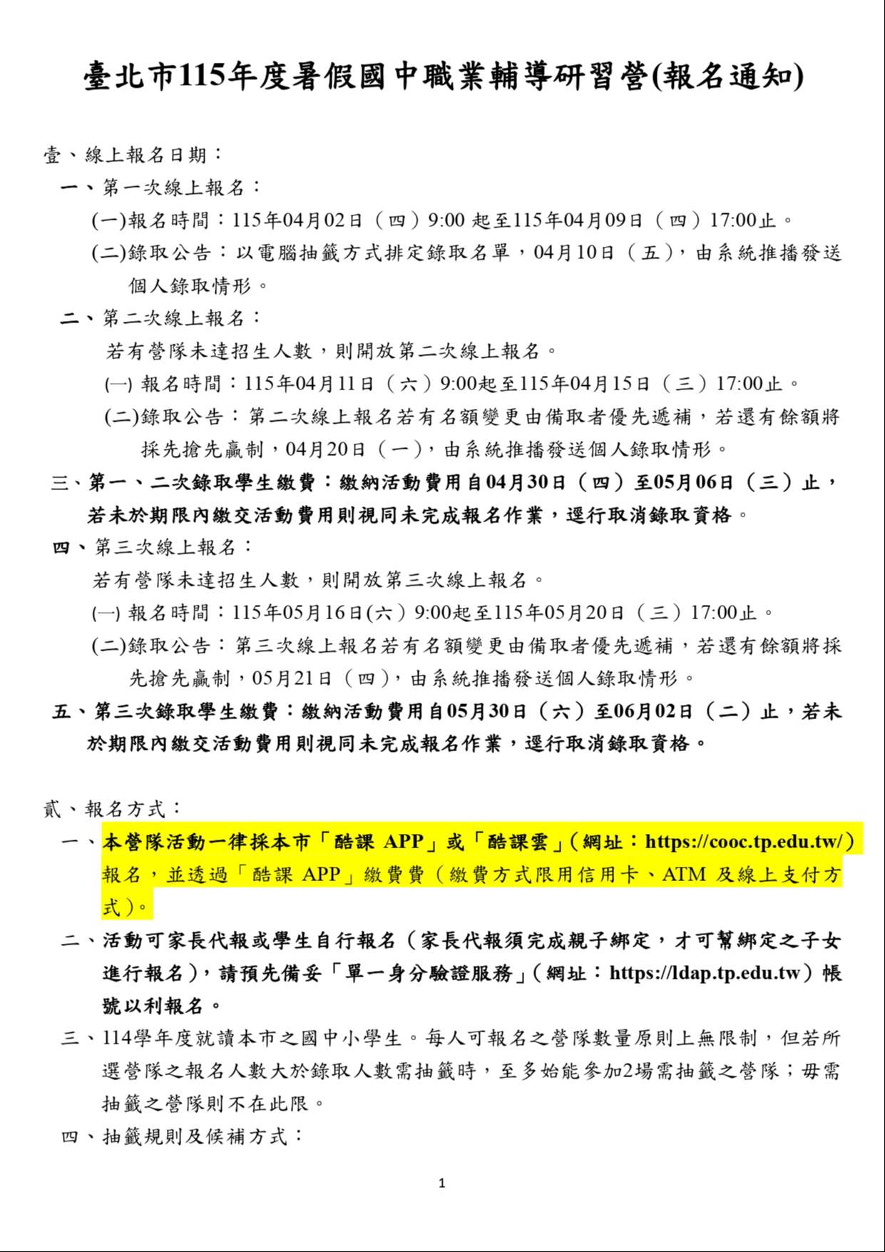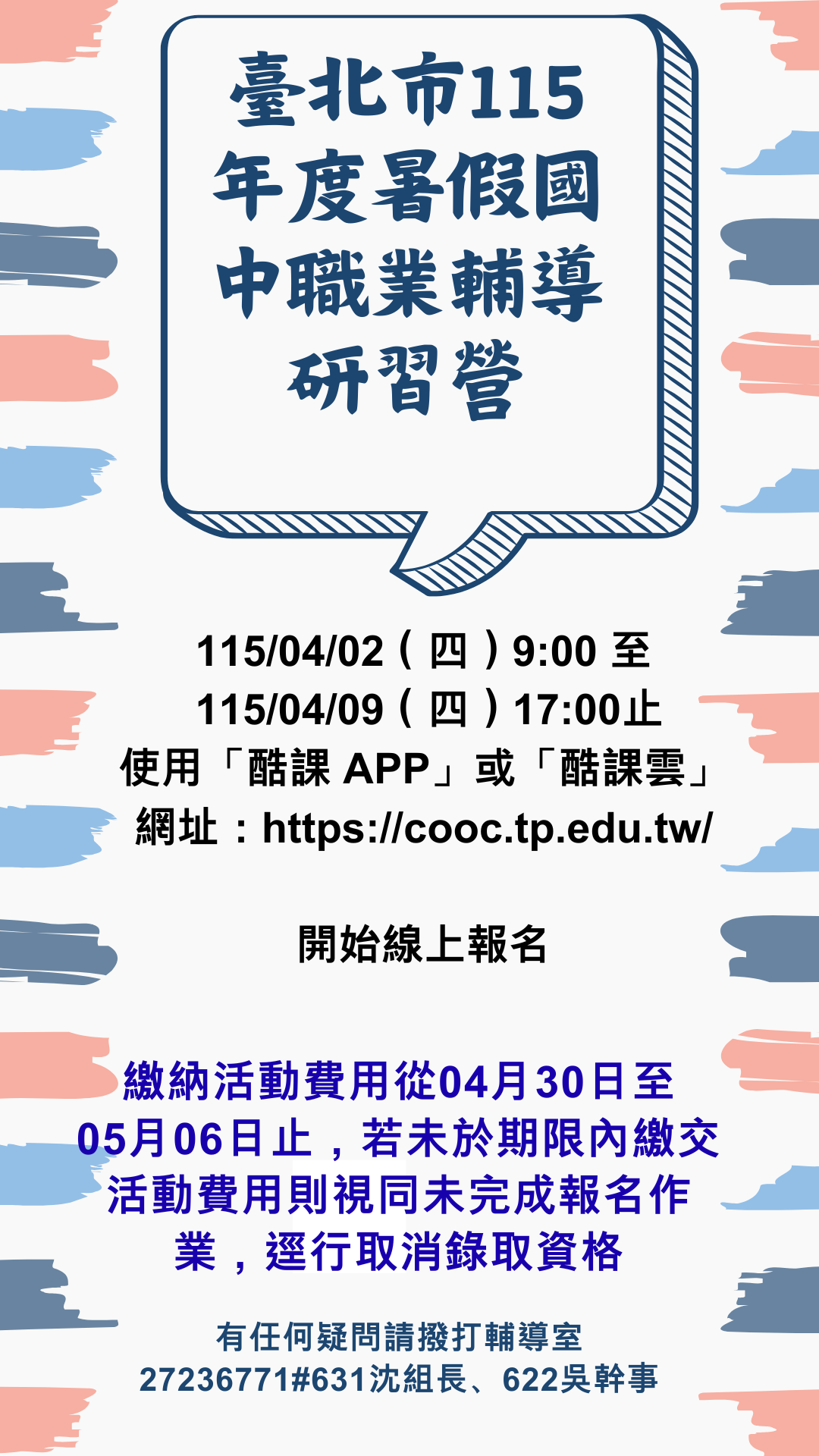 (4月2日早上9點開始至4月9日下午5點報名,錄取後,4月30日至5月6日繳費,未於期限內繳費視同未完成報名作業,取消錄取資格)