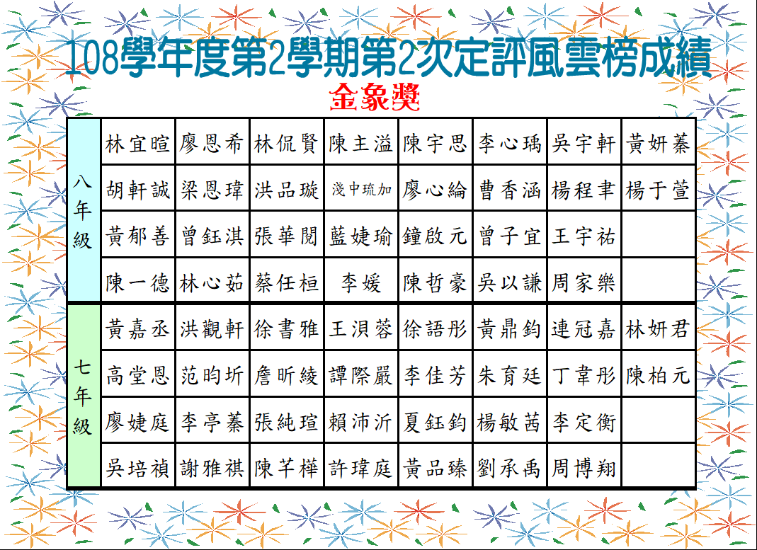 108學年度第2學期第二次定期評量七八年級風雲榜