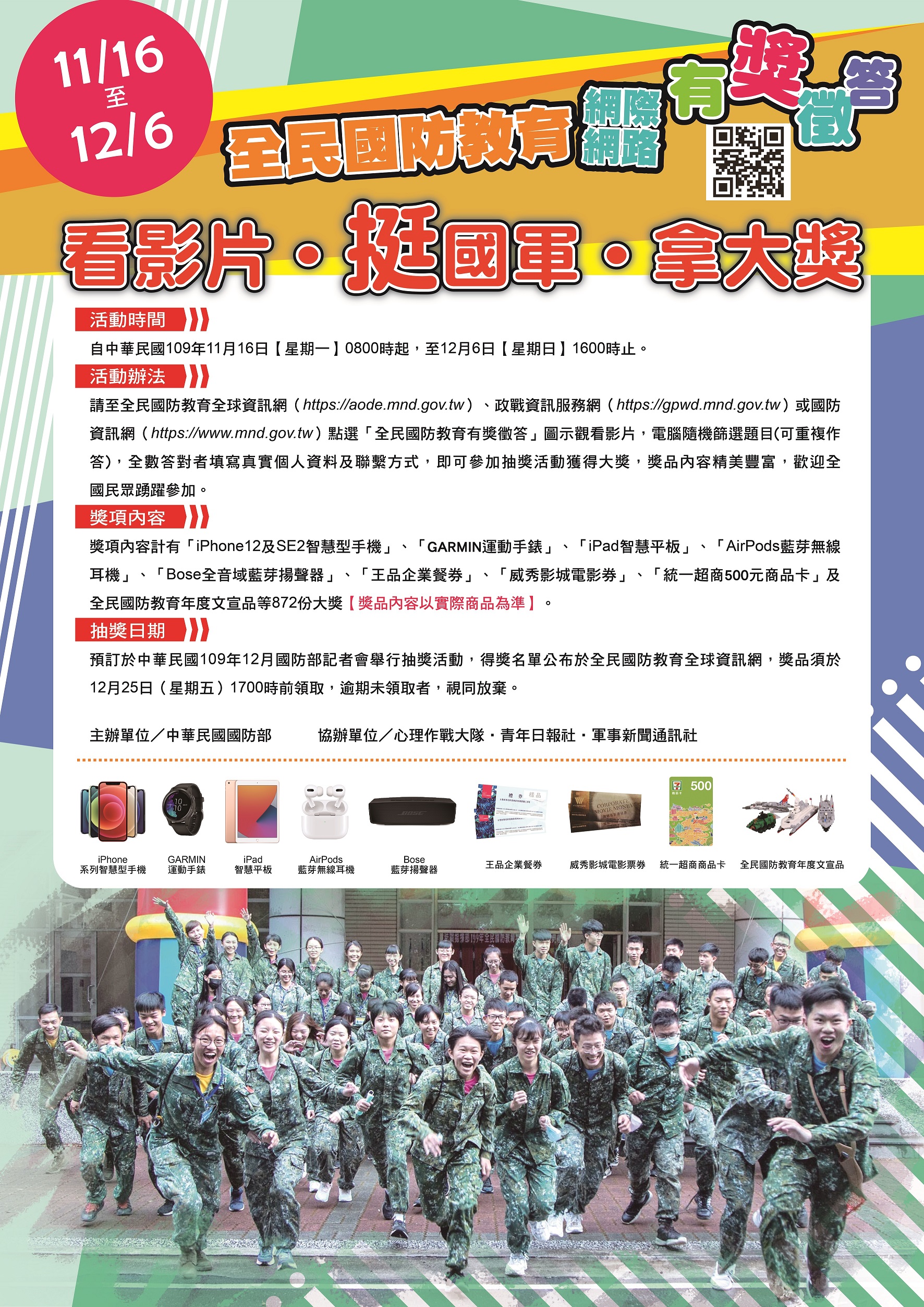 二、旨揭活動自109年11月16日上午8時起至12月6日下午4時 止,活動辦法詳如實施計畫,惠請協助於所屬管道(機關 或學校網站、電子看板、捷運月臺跑馬燈或廣播託播稿) 宣傳活動訊息。 三、宣傳文字稿如下,請參酌運用: (一)30字:國防部辦理「全民國防教育網際網路有獎徵答活 動」,詳情請見政戰資訊服務網。 (二)60字:國防部辦理「全民國防教育網際網路有獎徵答活 動」,活動自11月16日8時起至12月6日16時止,獎項豐 檔,詳情請至國防部政戰資訊服務網(https://gpwd. mnd.gov.tw/)查詢。 (三)90字:國防部辦理「民國109年全民國防教育網際網路有 獎徵答活動」,活動自11月16日8時起至12月6日16時 止,活動採「看影片,後答題」方式,答題者觀看影片 後,由系統隨機篩選10題,全數答對者填註個人資訊, 即可參加抽獎,有iPhone智慧型手機、Garmin運動手 錶、ipad智慧平板等13項獎項,計872名,歡迎民眾踴躍 參加,詳情請至國防部政戰資訊服務網(https://gpwd. mnd.gov.tw/)查詢。