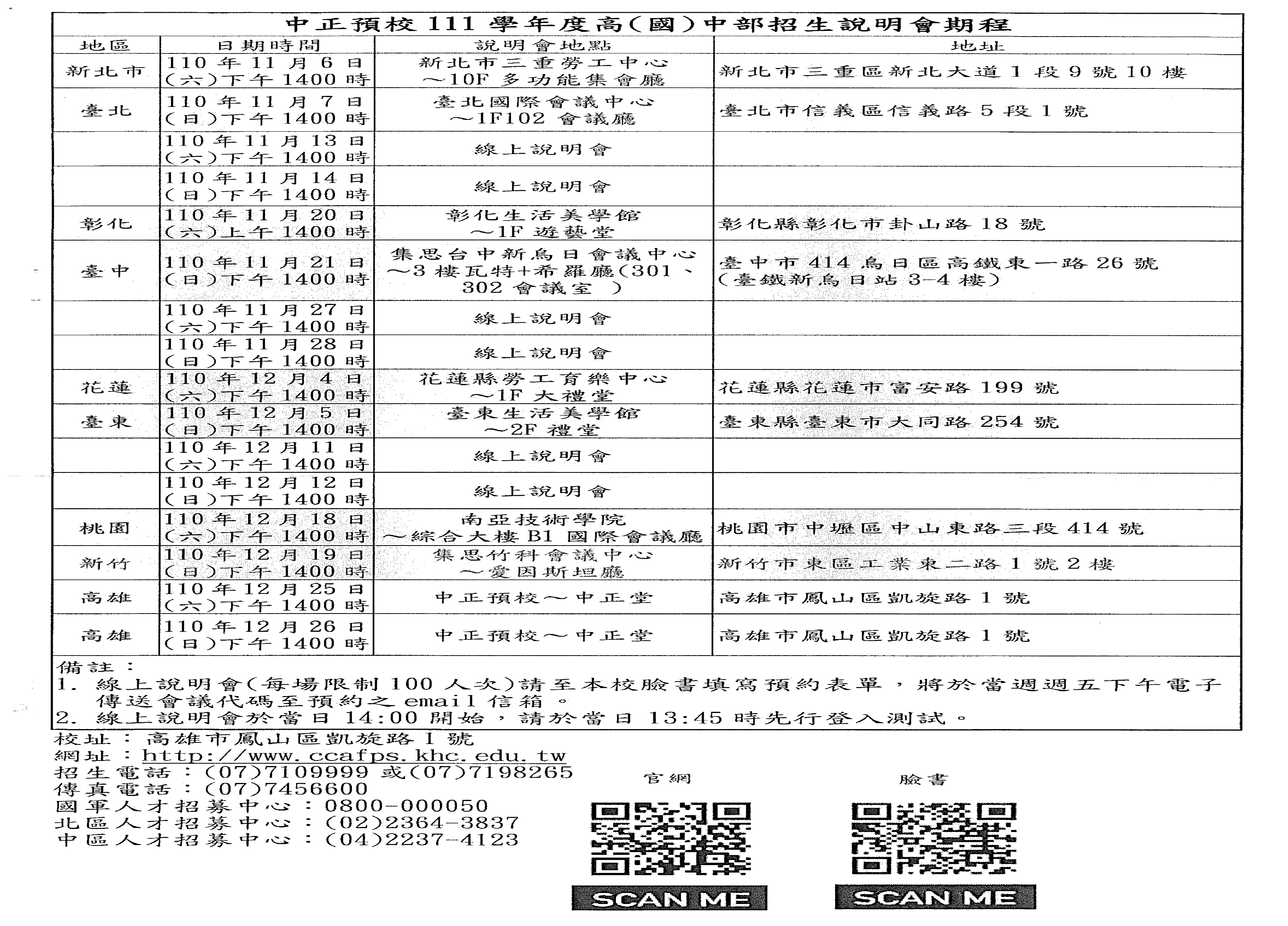 旨揭說明會期程表如附件,另配合場地借用及防疫規定, 如各期程及場地有異動,將於該校官方網站及臉書(中正 國防幹部預備學校粉絲團)專頁公告。