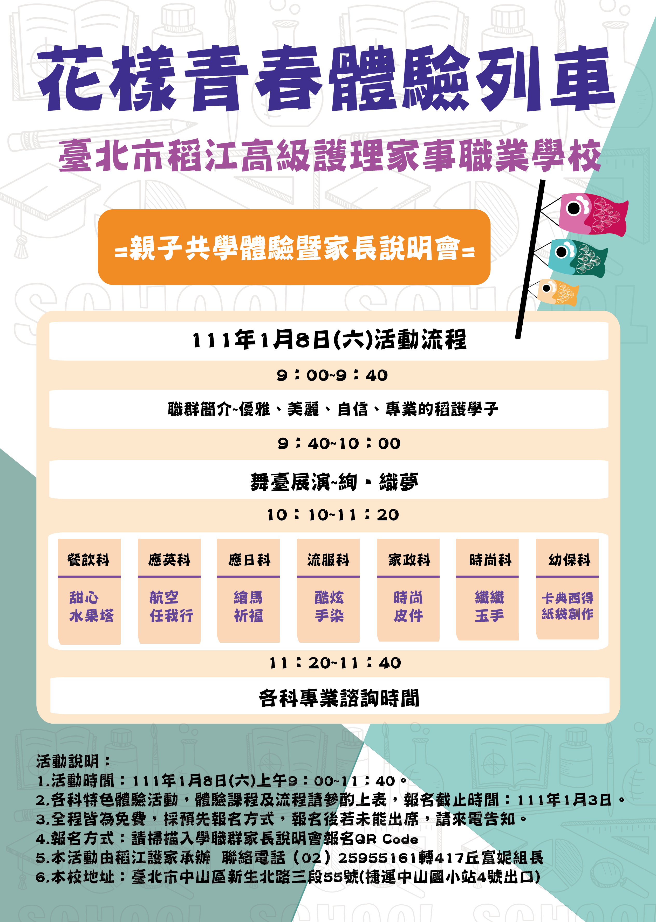 二、本學期於111年01月08日(星期六)舉辦「稻江護家花漾親子 共學體驗」,誠摯邀請 貴校八、九年級學生參加,並歡 迎 貴校教師或學生家長共同參與。