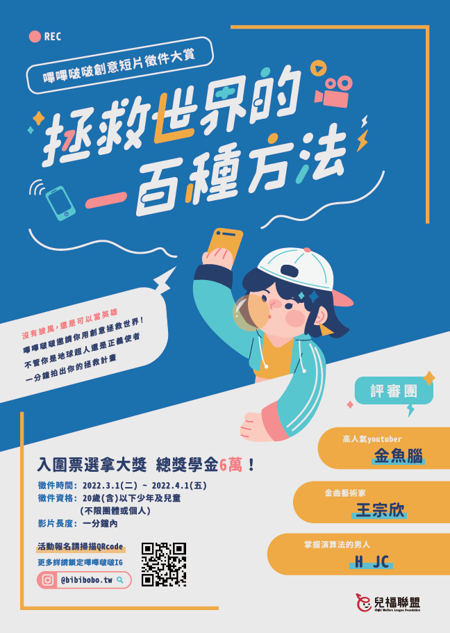 三、為響應「兒少表意權」的推廣,兒盟自2/21至4/1舉辦「嗶 嗶啵啵創意短片徵件大賞」,邀請7~20歲之兒童少年拍攝 一分鐘內的短影音,針對主題「拯救世界的一百種方法」 發想,以充滿創意且引起共鳴的作品令大眾看見兒少聲音 的力量。我們將於4/8公佈入圍決賽階段的十組作品,並發 起投票活動,邀請網友們投出自己喜愛的作品,並於5/2公 佈前三名,將獲得總獎學金6萬,並出席頒獎典禮。徵件活 動詳情請洽兒福聯盟官網:https://www.children.org.tw /news/news_detail/2708,或是兒少IG平台-嗶嗶啵啵 (@bibibobo.tw)。