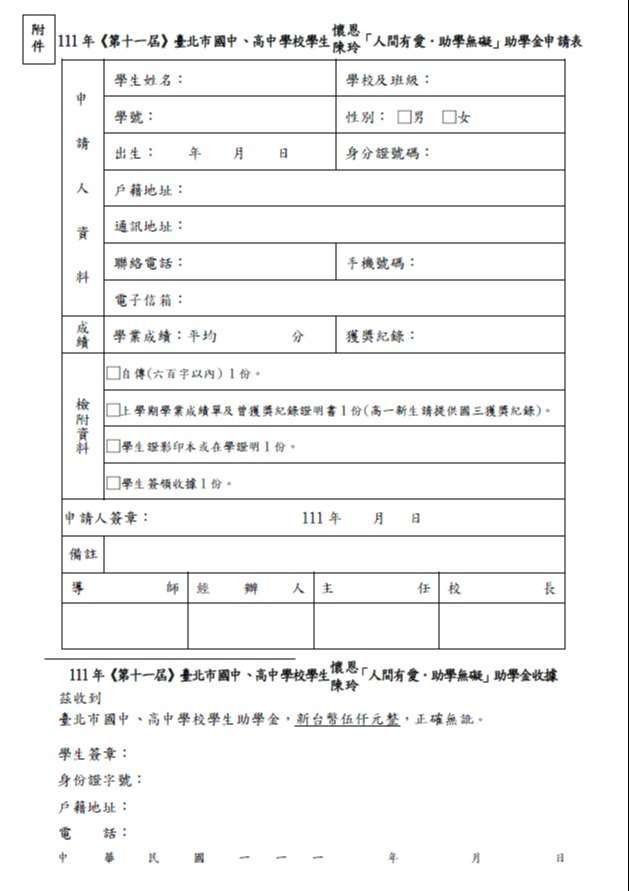 四、獎助對象:就讀於臺北市國中 、高中職含進修部低收入戶或清寒學生,共計220位名含身心障礙學生名額40名 。 【 每 所 學校 1~2位名額特殊教育學校每 所 5 ~10 位名額 】