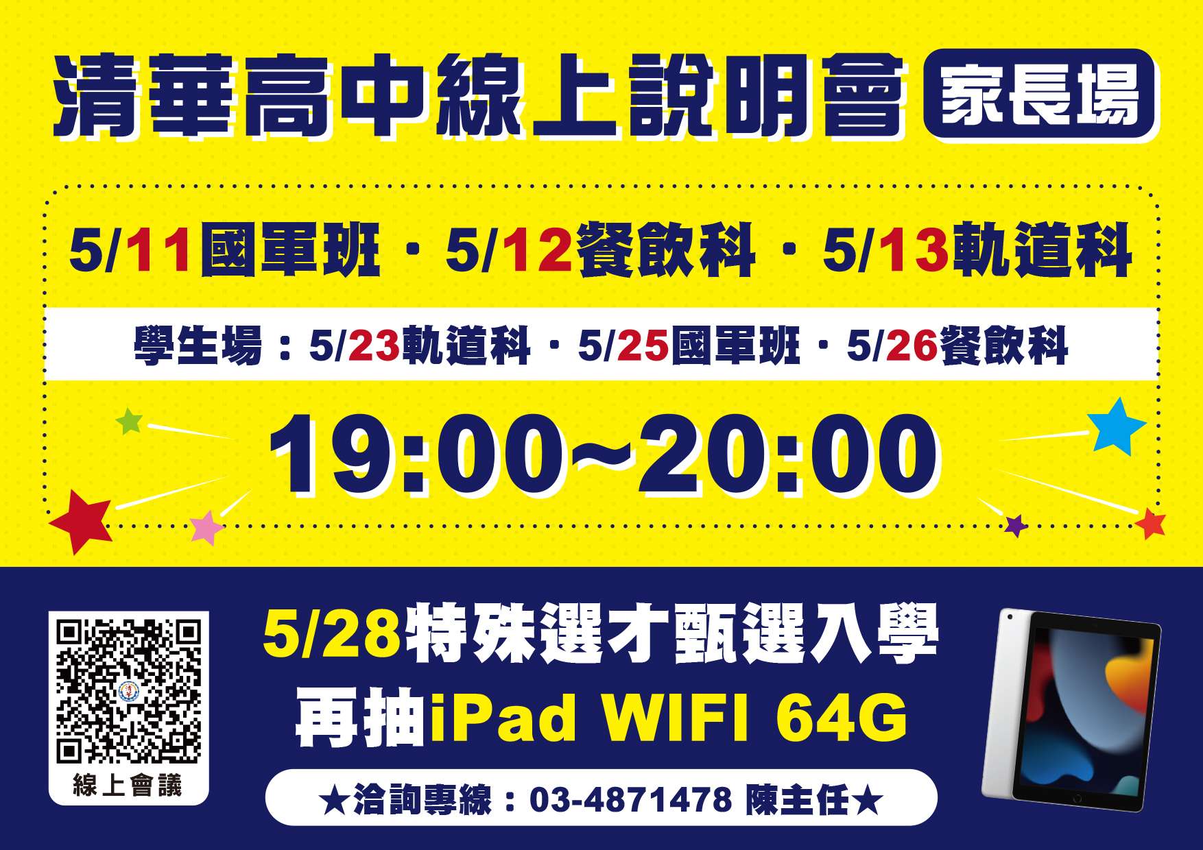 一、有關 私立清華高中「群科線上說明會-家長場」,對象:國中九年級家長。