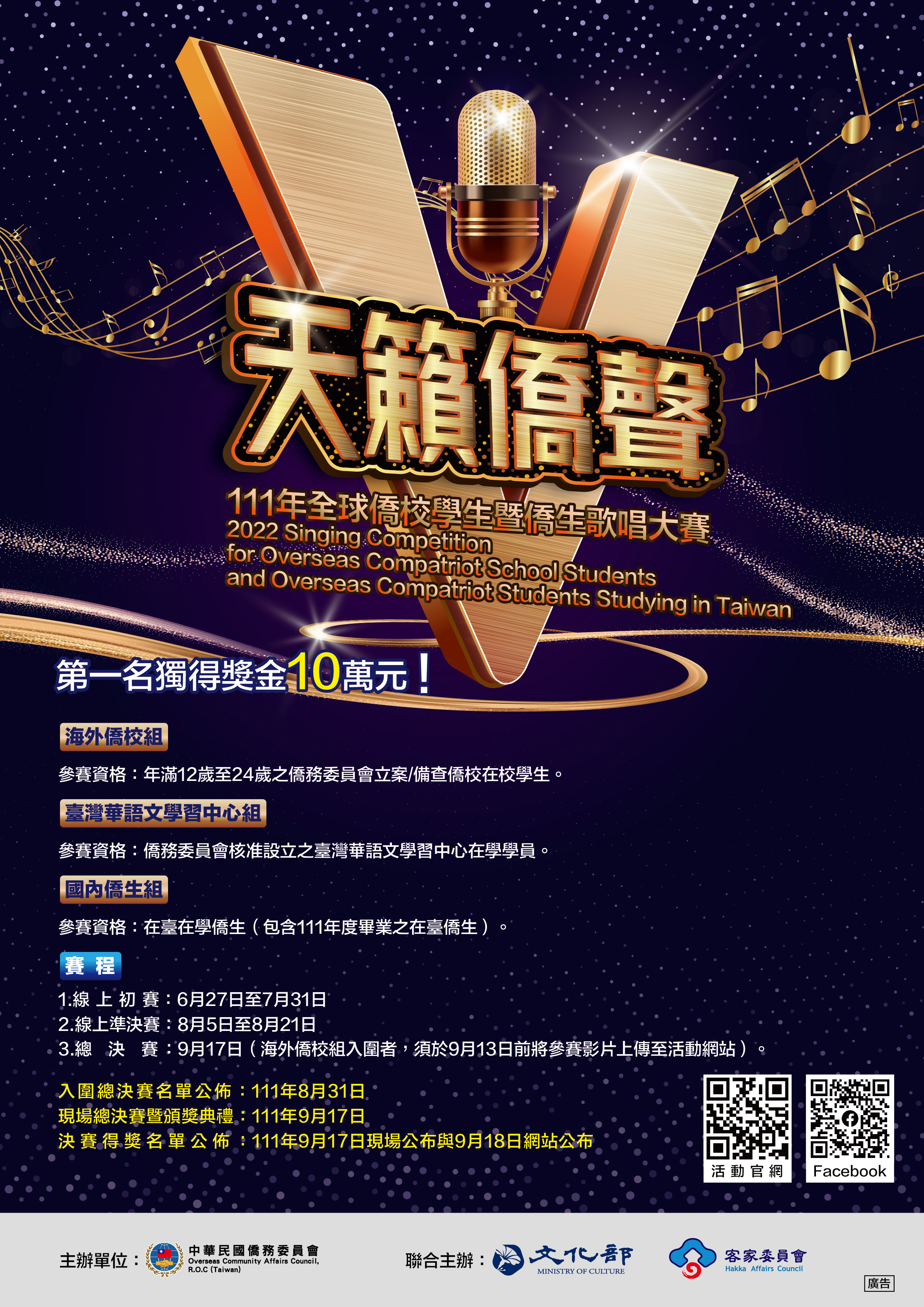 僑務委員會為鼓勵全球僑校學生、臺灣華語文學習中心及 國內僑生藉由傳唱華語、閩南語及客語等歌曲,強化華語 文學習動機、認識及體驗臺灣不同族群語言及流行音樂文 化,爰規劃辦理旨揭賽事。