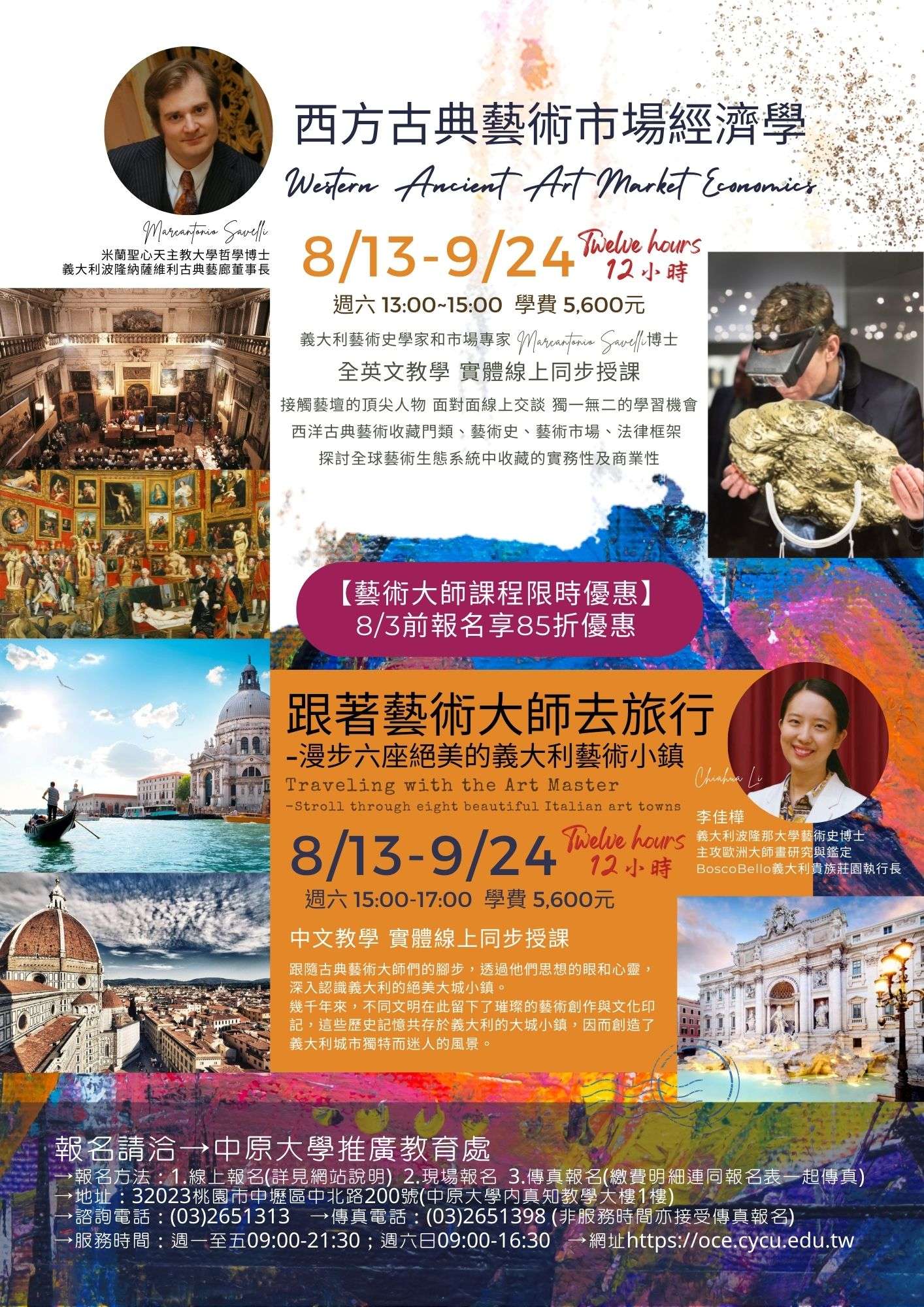 一、在全球化浪潮下,培養藝術素養是每一個人對自己最重要的投資,西方古典藝術為全球菁英追求的「共通語言」。 「西方古典藝術市場經濟學」課程涵蓋主要西洋古典藝術收藏門類,授課內容融合藝術史、藝術市場,及法律框架等主題,並探討當今全球藝術生態系統中收藏的實務性及商業性問題;「跟著藝術大師去旅行-漫步六座絕美的義大利藝術小鎮」課程將帶領學員跟隨古典藝術大師們的腳步,透過他們的眼,重新認識義大利的絕美大城小鎮,讓學員在之後重返義大利旅行時,能擁有更深刻與動人的體驗。