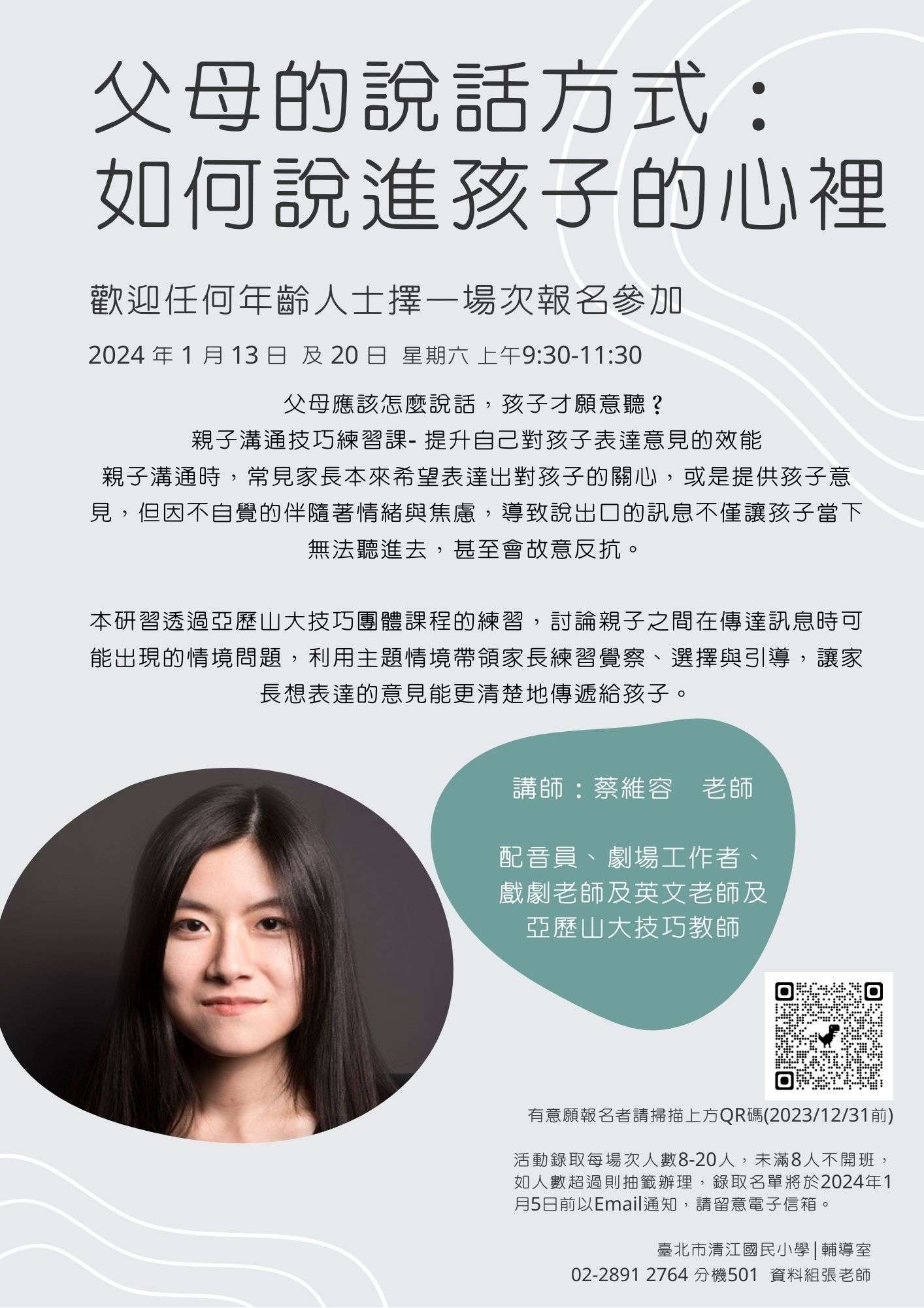 一、親職講座活動內容: (一)主題:父母的說話方式_如何說進孩子的心裡 (二)講師:蔡維容 老師 (三)日期:113年1月13日、1月20日 星期六(擇一場次報名) (四)時間:上午 9:30-11:30 (五)地點:北投區清江國小 陽明樓多功能教室2